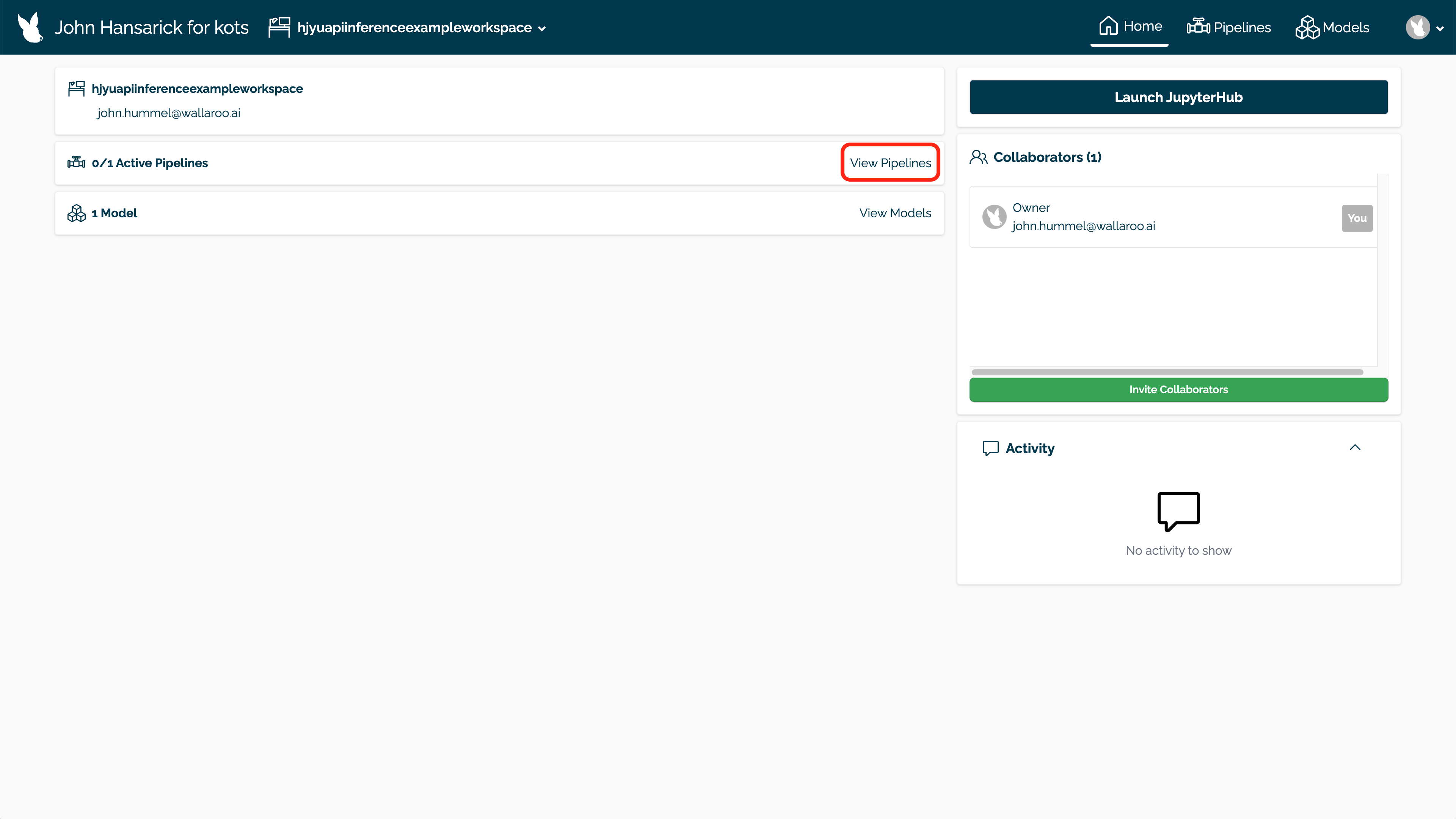 The first part is to return to your Wallaroo Dashboard. In the top navigation panel next to your user name there’s a drop down with your workspaces. In this example it just has My Workspace. Select View Workspaces.