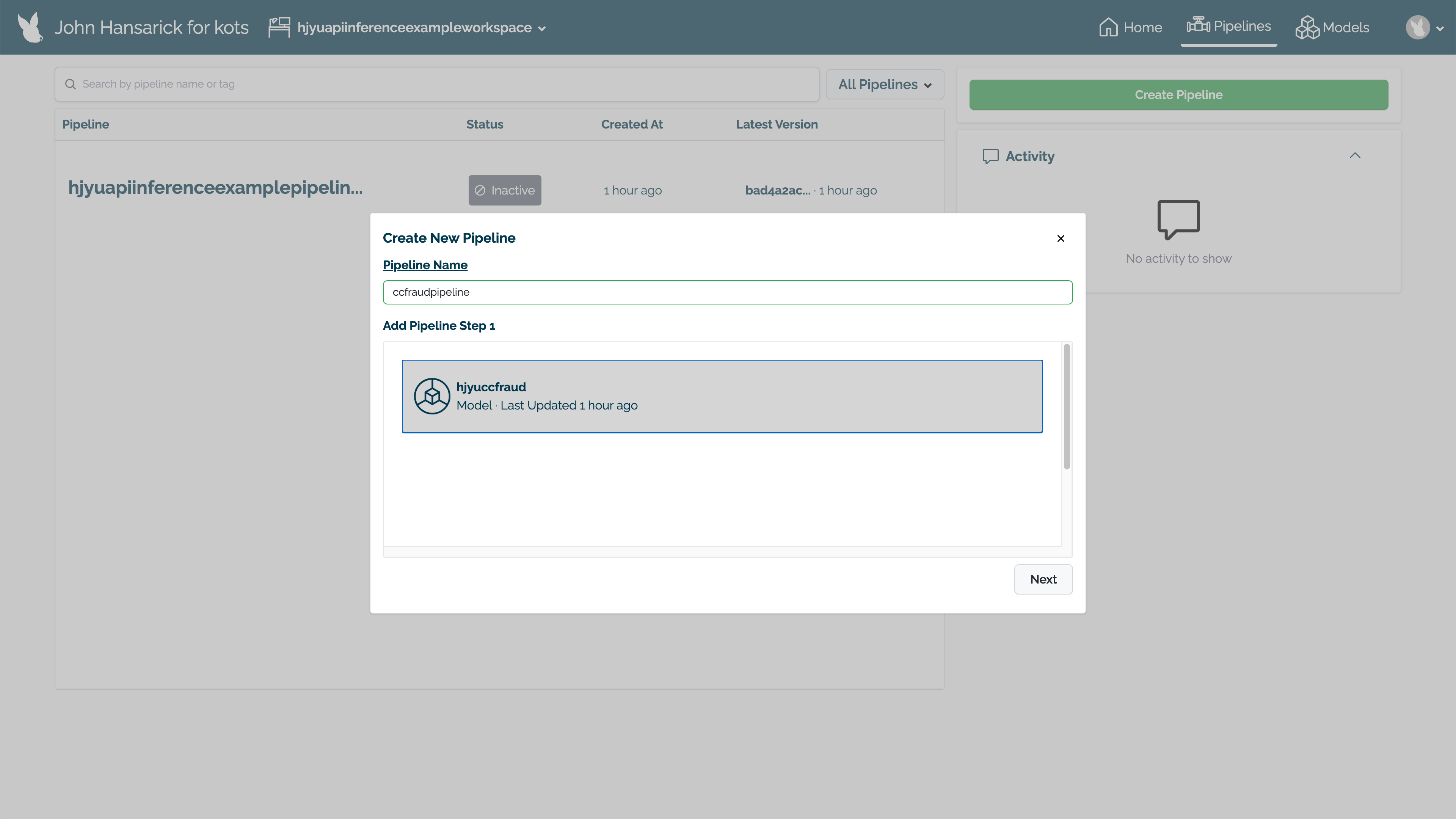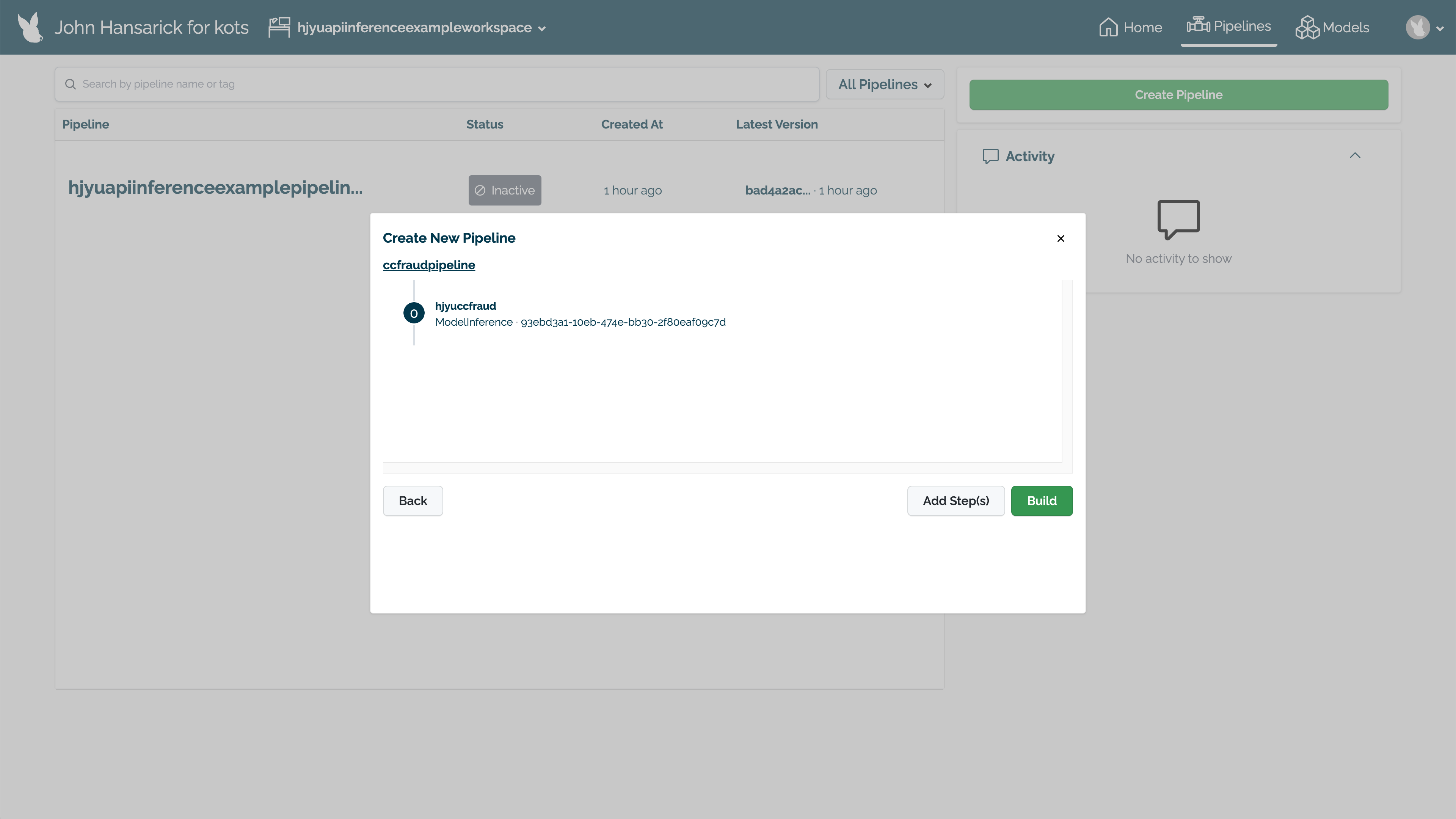 - Create or Use Existing Pipelines: Create or use an existing pipeline. This is where you’ll set the steps that will ingest your data, submit it through each successive model, then return a result.
