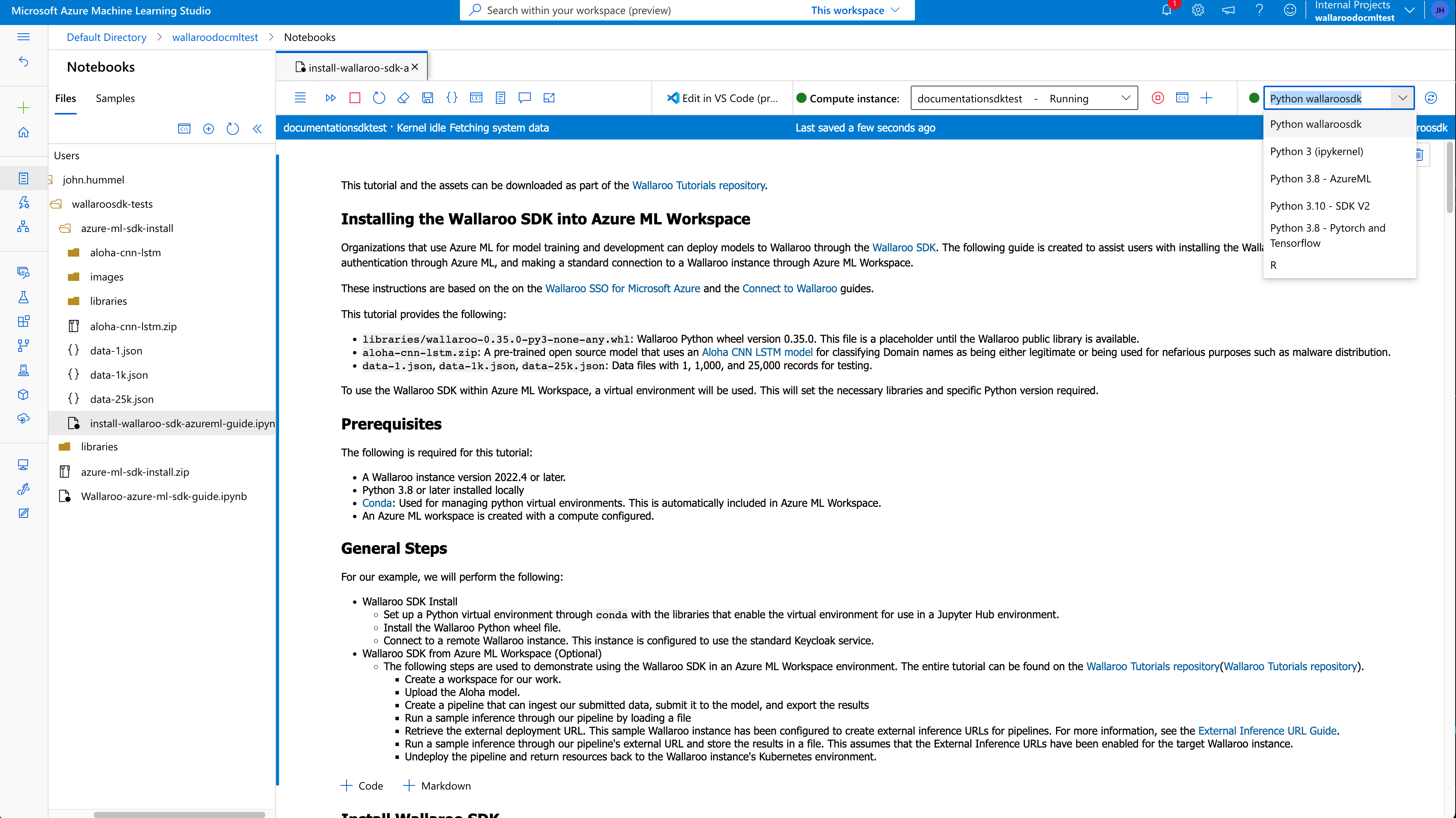 - From the Kernel selection dropbox on the upper right side, select the new virtual environment - in this case, wallaroosdk.