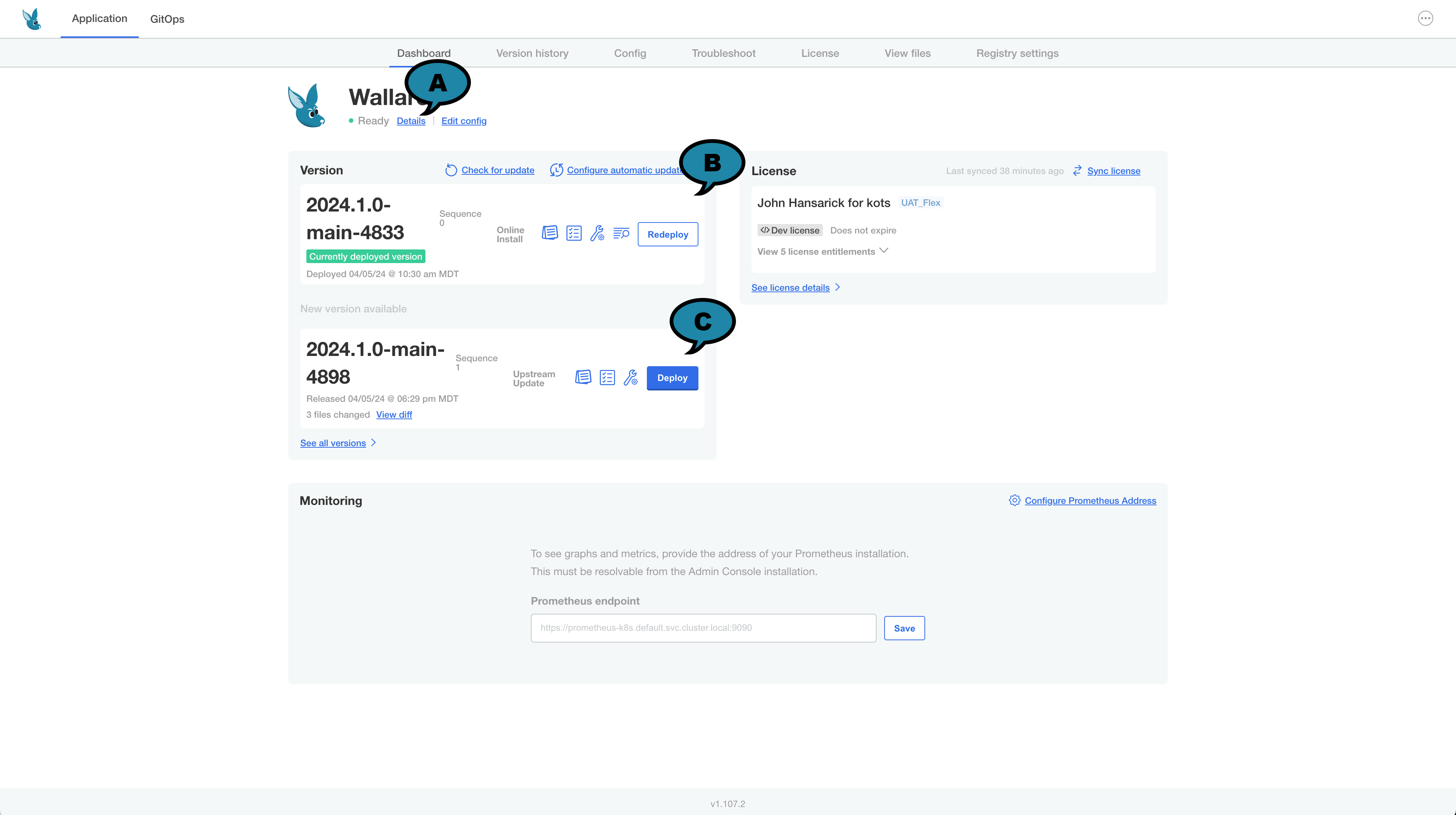 - If there is a new version of Wallaroo to install based on your Wallaroo license type, it will be displayed under the Version (B) display as New Version Available. Select Check for updates to check for updated versions.
