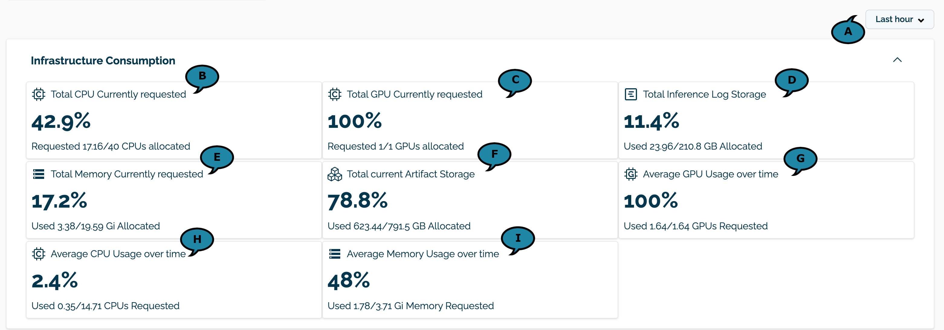 The Infrastructure Consumption section shows the overall consumption of resources requested for model, orchestrations, and other artifacts. This section is not updated unless the page is refreshed or the filter values updated.