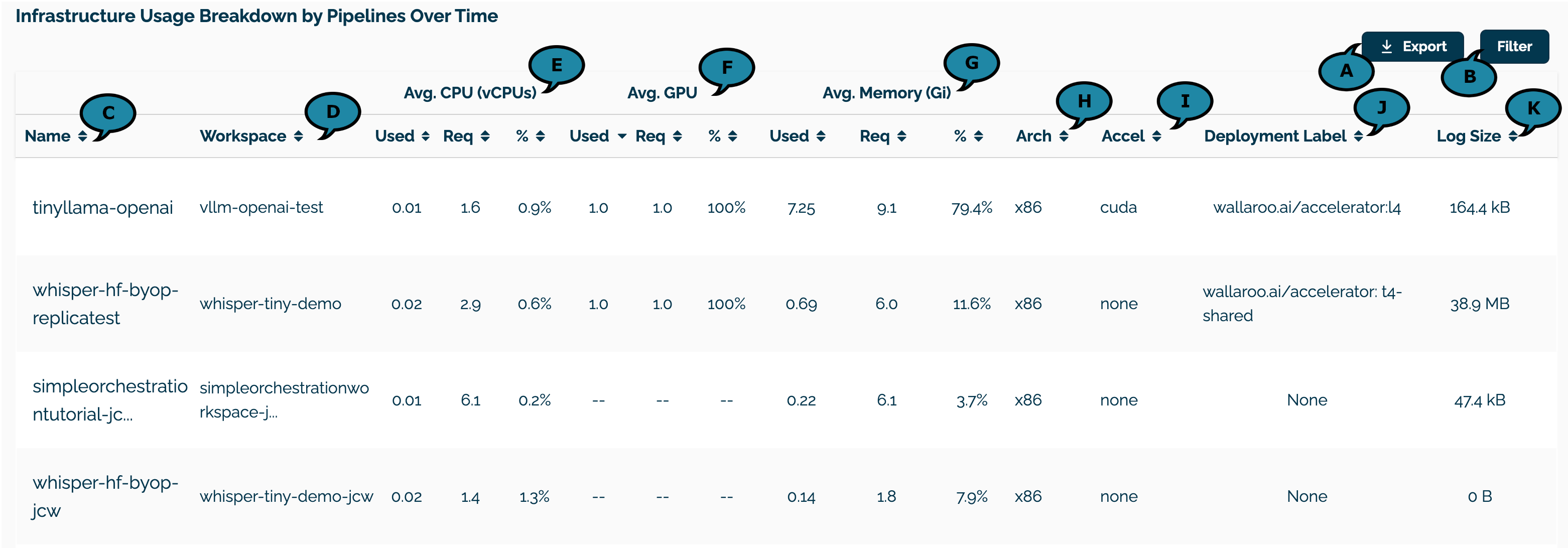 The Infrastructure Usage Breakdown by Pipelines Over Time section shows currently deployed pipelines and the resource allocation for each pipeline against requested resources for the selected time range. This section is not updated unless the page is refreshed or the filter values updated.